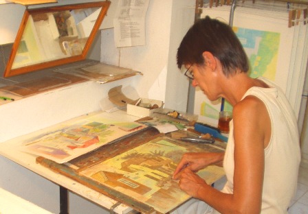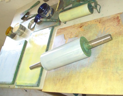 The printing ink is put on the ink stones and thinly rolled out on the plate with rolling devices. The first colours are bright; later on in the process I use darker colours on top of the lighter ones.