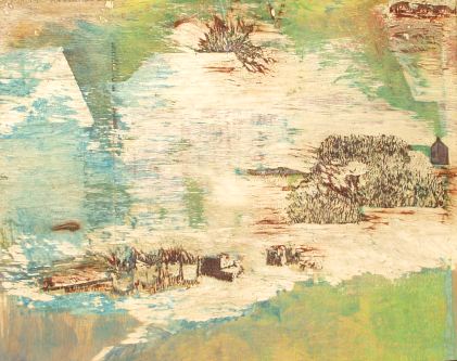 The work is done; the plate is nearly empty. Only the last printing edition that has to be done, very often also the darkest one, is visible. It is impossible to use this plate for other prints; at the end of the process, it has been reduced to little dark pieces. This is where the name ‘reduction-method’ comes from: all colours are printed and cut out from only one wooden plate. I consider this as an exciting process, because every act has a consequence for the prints that follow.
