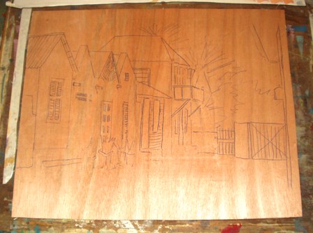 The beginning of the printing process: I copied my sketch mirror wise on a triplex plate. The drawing is lacquered with shellac to prevent that during the printing and cleaning of the plate, the drawing will disappear. For the first printing edition, I cut out the parts that need to remain white.