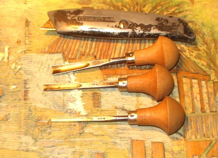 The cutting process evolves with gouges of different sizes and shapes, and with the help of a Stanley knife.
