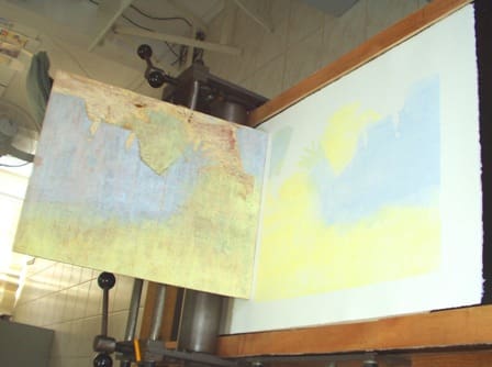 De met drukinkt ingerolde plaat heeft op het papier een afdruk achtergelaten, doordat het geheel van plaat en papier onder de pers is doorgedraaid. De eerste drukgang is klaar.