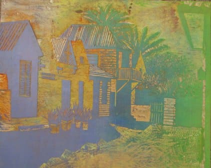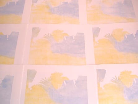 Na iedere drukgang snijd ik stukken hout, die de goede kleur hebben afgedrukt, eruit. Die partijen blijven dus bij een volgende keer ininkten hun kleur behouden. Over de andere gedeelten komt een volgende kleur.