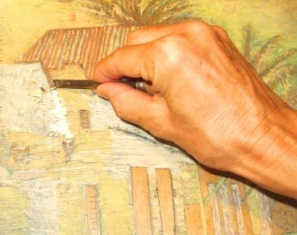 Het uitsnijden gaat met gutsen in verschillende vormen en maten, en met behulp van een Stanleymes.